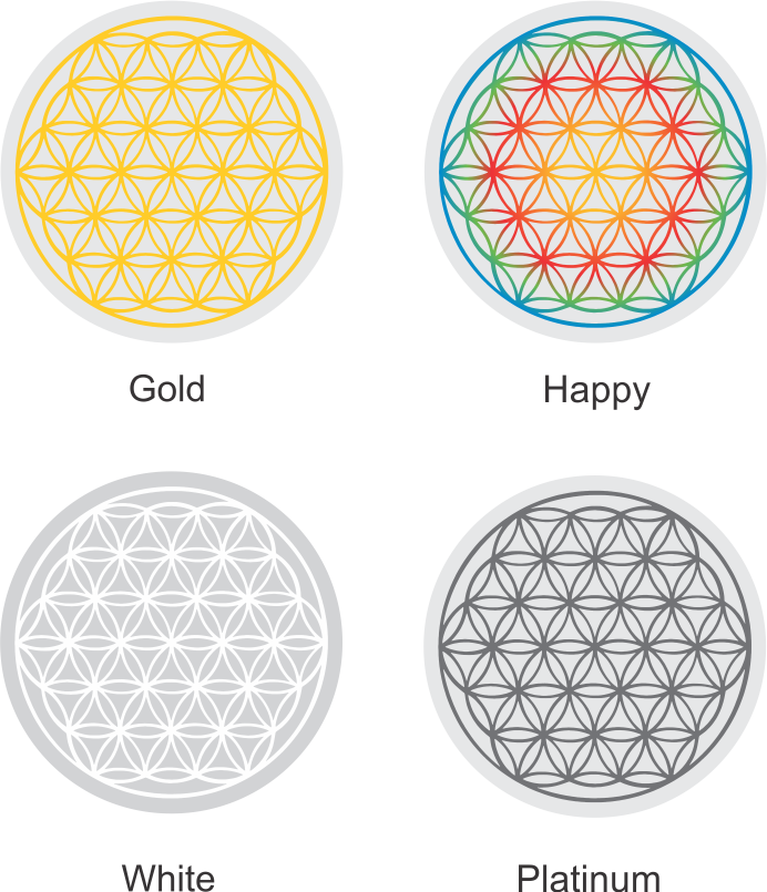 Since all of our products are created from the Golden Ratio, you will get revitalised water from all of them. But with the Flower of Life on the bottom there is also an opportunity to enrich the water with additional information. There are 4 different Flowers of life and they work as spices – they make revitalised water even better and richer. Colours do have a variation of different impacts on the human being and arouse emotions and associations.