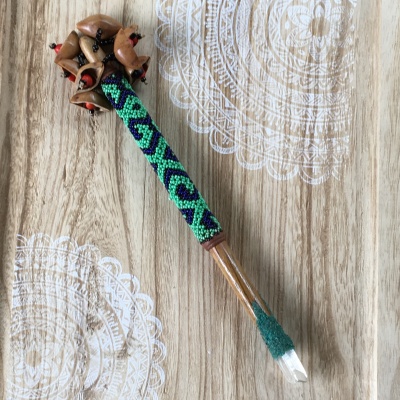 Rattle/wand with twin clear quartz point and hand beaded with green, blue and black beads The Shipibo-Conibo are an indigenous people along the Ucayali River in the Amazon rainforest in Peru. Many of their traditions are still practiced, such as ayahuasca medicine work. Medicine songs have inspired ...Read more