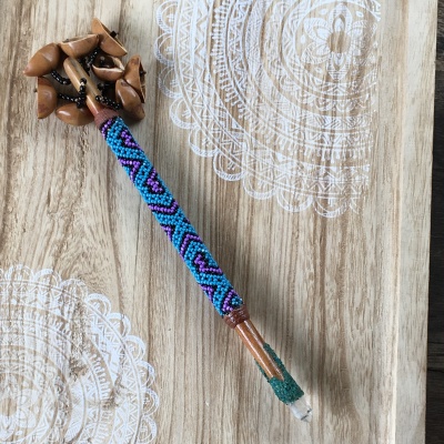 Rattle/wand with clear quartz point and hand beaded - blue, purple and black