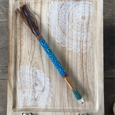 Rattle/wand with clear quartz point and hand beaded ayahuasca vine with leather tassels - these are used to clear a persons energy field - blue, green and black