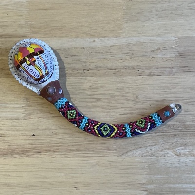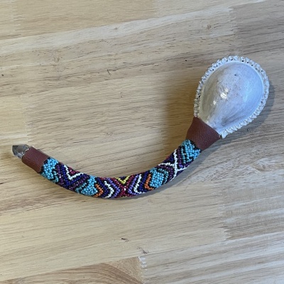 Hand painted rattle with mushrooms and multi-coloured beaded handle, cat eye, chrysocolla and quartz point