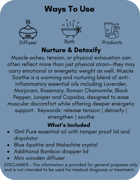 Muscle Soothe Essential Oil Blend is crafted for massage, baths, or diffuser use to support physical recovery and emotional release. It eases muscular tightness, encourages circulation, and nurtures emotional balance—helping dissolve old patterns held in the body.