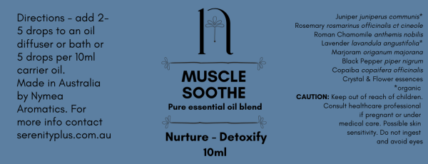nymea_aromatics_pure_oils_with_bamboo_dropper_cap_10ml_muscle_soothe_with_blue_apatite_and_malachite_crystalmuscle_soothe_front_pure_oilmuscle-soothe-back-label-pure-oil-blend-nymea-aromatics-serenity-plus-bathurstmuscle-soothe-pure-oil-blend-label-78x30mm