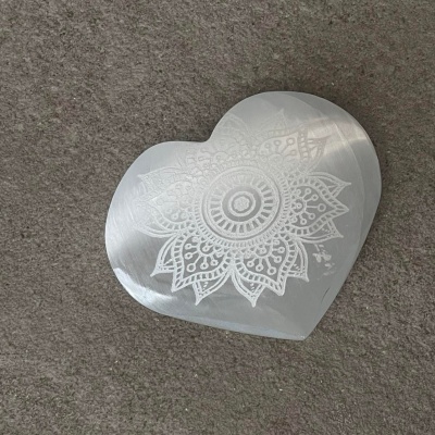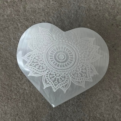Mandala carved Selenite Heart Size approx 7cm to 8cm wide x 6.5cm to 7cm high