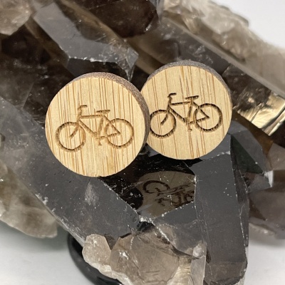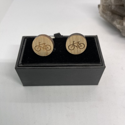 Timber bicycle etched cufflinks with soild metal back in giftbox