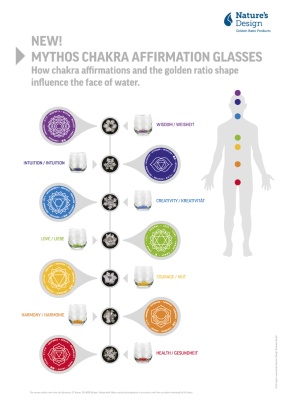 Drinking vitalized water influenced by special colours, symbols, words of affirmation and the shape design based on golden ratio, can help us to balance our chakras.