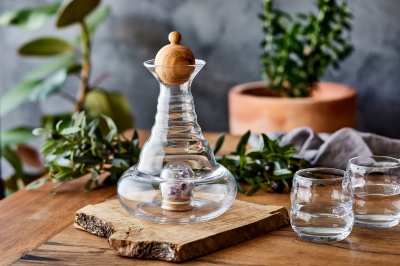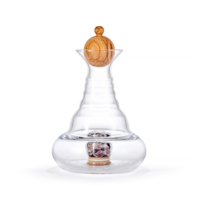 The carafe Alladin is the standard version in the range of carafes. The Alladin Gemstone has a cavity in the base which can be filled with included gemstones of Amethyst, Clear quartz and Rose Quartz or gemstones of your choice. The Classic Alladin design of 6 cascading sequential sections, with the volume of each section corresponding to one of the first 6 numbers of the universal Fibonacci sequence, aligns with the geometry found everywhere in nature. Revitalized water shows a 6-sided crystalline structure which corresponds to its increased level of energy and life force.
