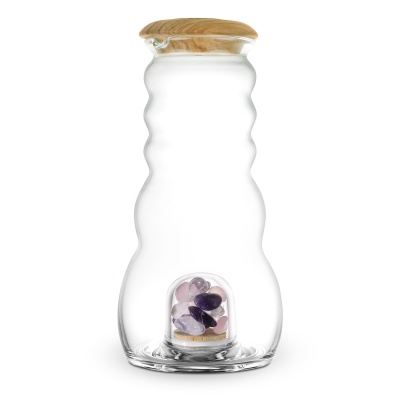 1.5 Litre Cadus Carafe Gem with Olive wood lid. Includes 50 grams of Spring Water gem mix: Clear Quartz, Amethyst and Rose Quartz.