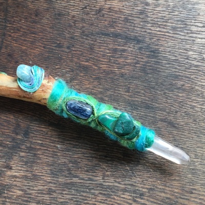 Hand made rattle carrying the energy of Deer, Rabbit, Elephant and Parrot. Crystals of Peridot, Malachite, Kyanite, Aquamarine and a clear quartz window crystal and Eucalyptus