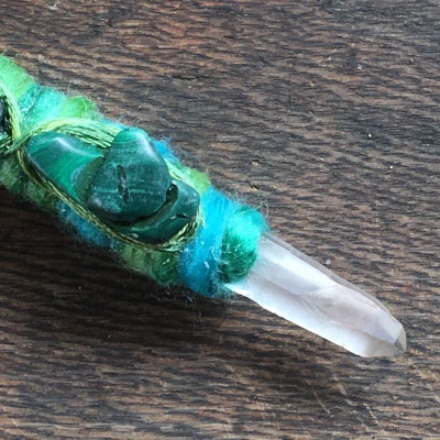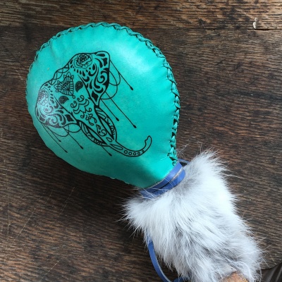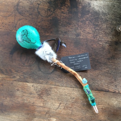 Hand made rattle carrying the energy of Deer, Rabbit, Elephant and Parrot. Crystals of Peridot, Malachite, Kyanite, Aquamarine and a clear quartz window crystal and Eucalyptus   Made by Lorraine @ Nymea