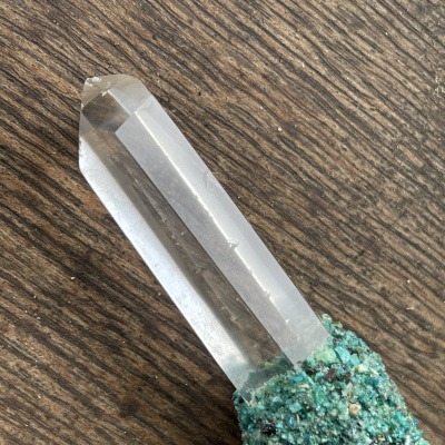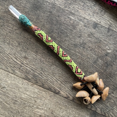 Rattle/wand with clear quartz point and hand beaded - pale green, Coral pink and black